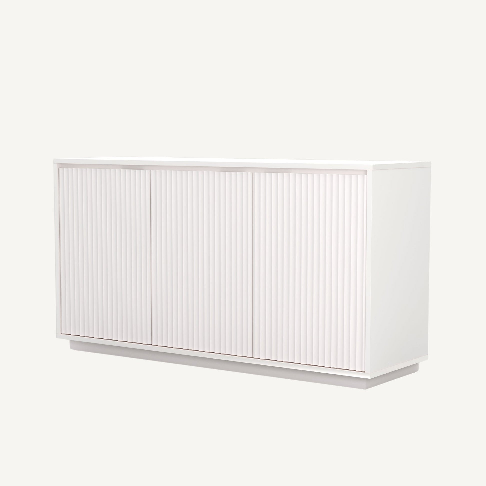 The Blanca sideboard combines style and functionality in a sleek design. Constructed with solid and manufactured wood, the clean-lined silhouette takes clutter and replaces it with neat storage. The three cabinets feature scalloped panel fronts that offer an extra touch of texture + visual dimension, while the cubby shelves inside make it easy to organize.