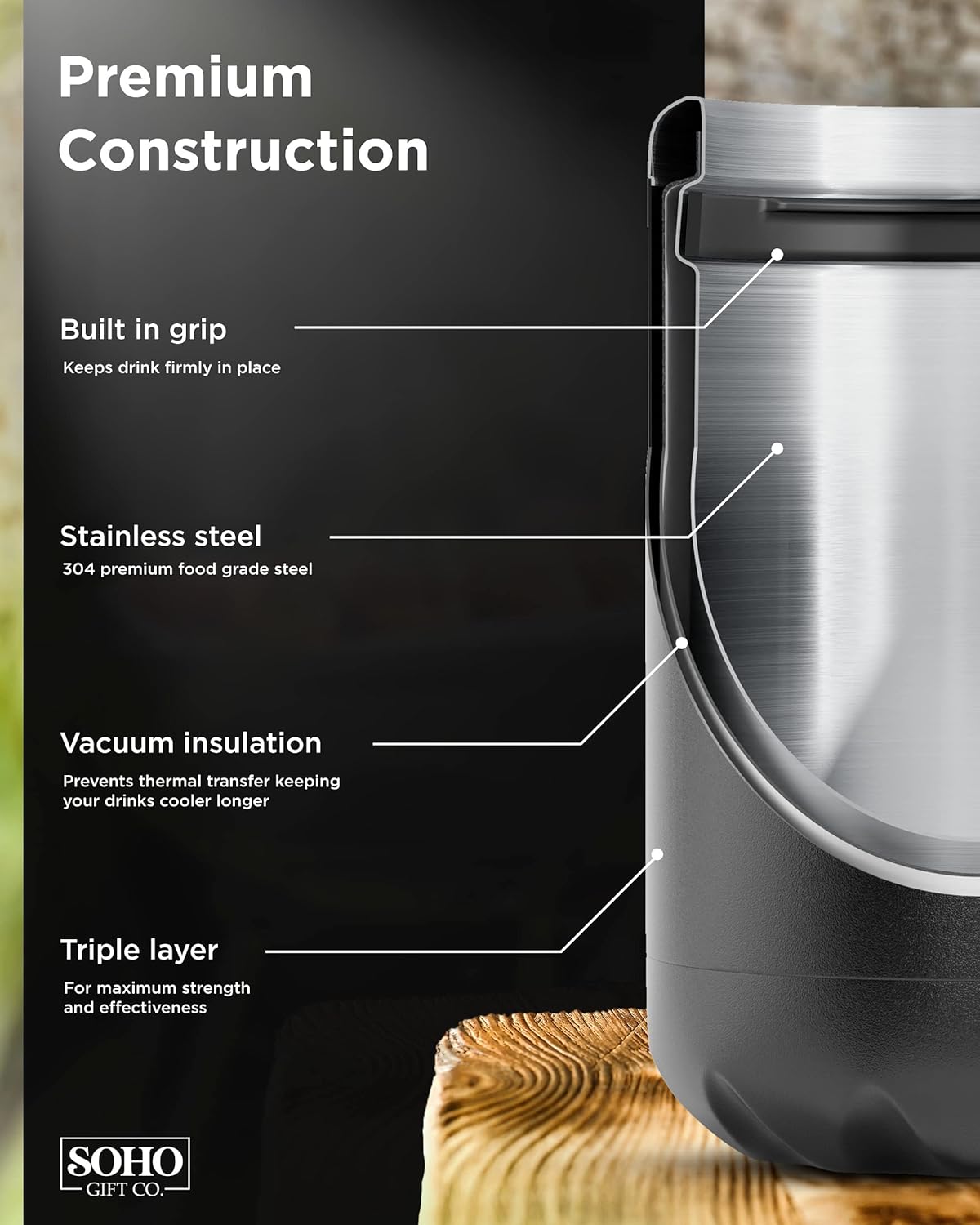 - Premium stainless steel with triple layer vacuum insulation keep drinks cool or hot for longer, without condensation on your hands or table.