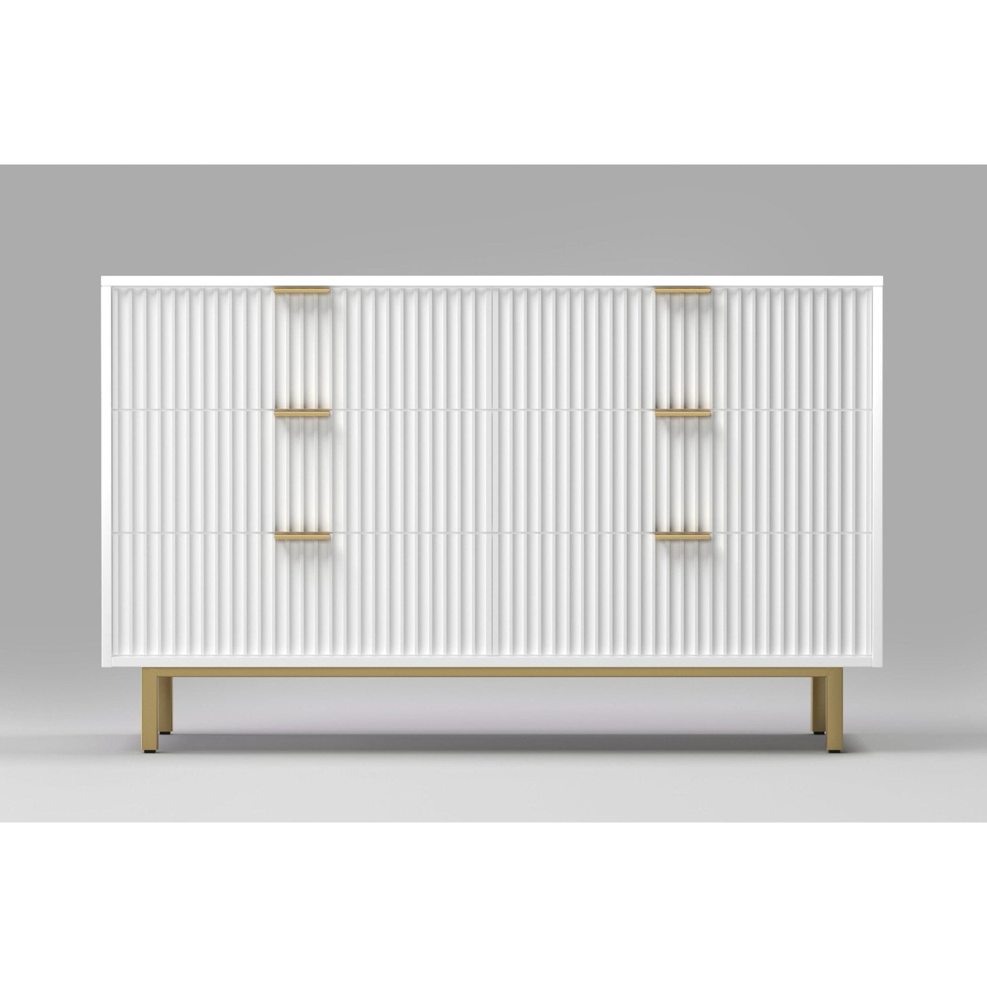 Introducing the Casey Dresser, a distinguished statement piece that will elevate any space. With textured drawers, gold accents and hardware, this piece will bring sophistication to your décor. Designed with metal ball bearing glides and English dovetail drawers, it provides both style and durability. Soft felt lining in the top drawers add a touch of extra luxury, while fully assembled delivery ensures convenience.