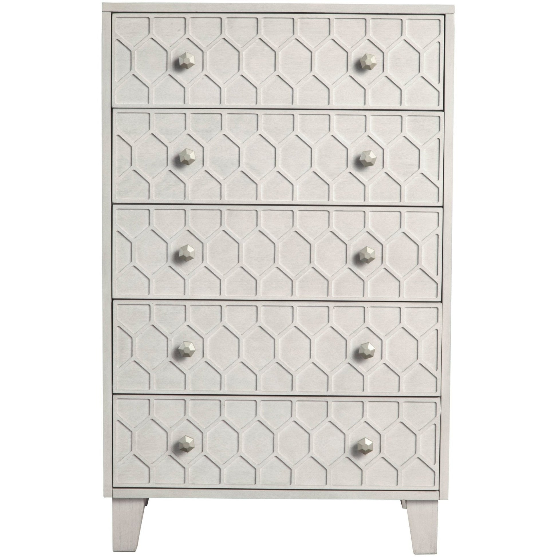 The Denver Five Drawer Chest will bring a fresh, natural look to your bedroom while providing that pop of texture with its unique honeycomb design. Whether you love clean lines and minimalist design or the latest styles in farmhouse chic, this refined commode will fit beautifully in your home. Handcrafted from Mahogany solids and veneer, this crisp wardrobe arrives fully assembled and features a light grey stain with geometric knobs that add a subtle contrast. This chest of drawers is built to last and includes a felt-lined top drawer as well as metal ball bearing drawer glides that provide convenience and safety to your storage.