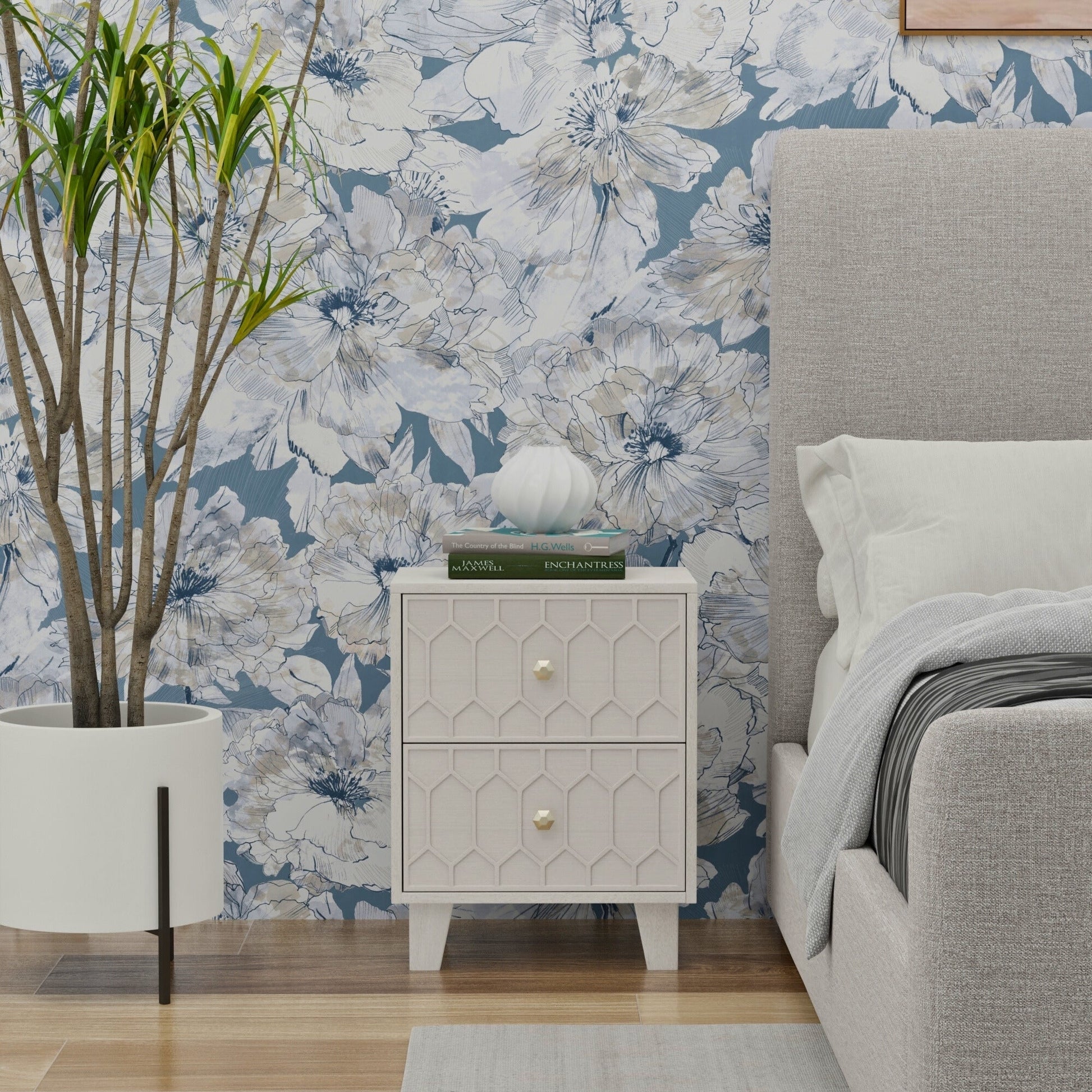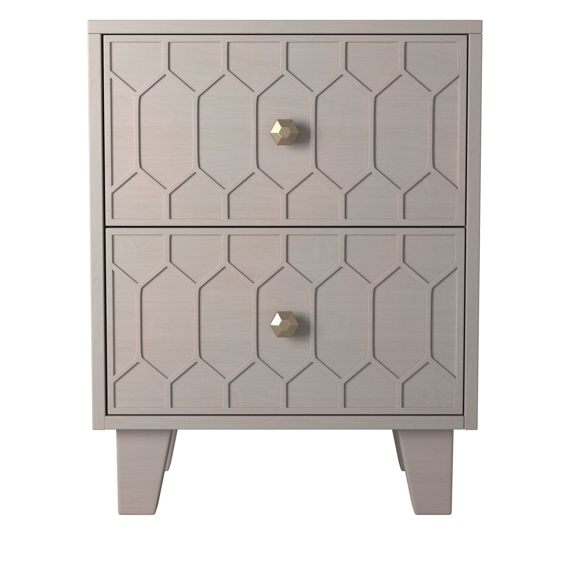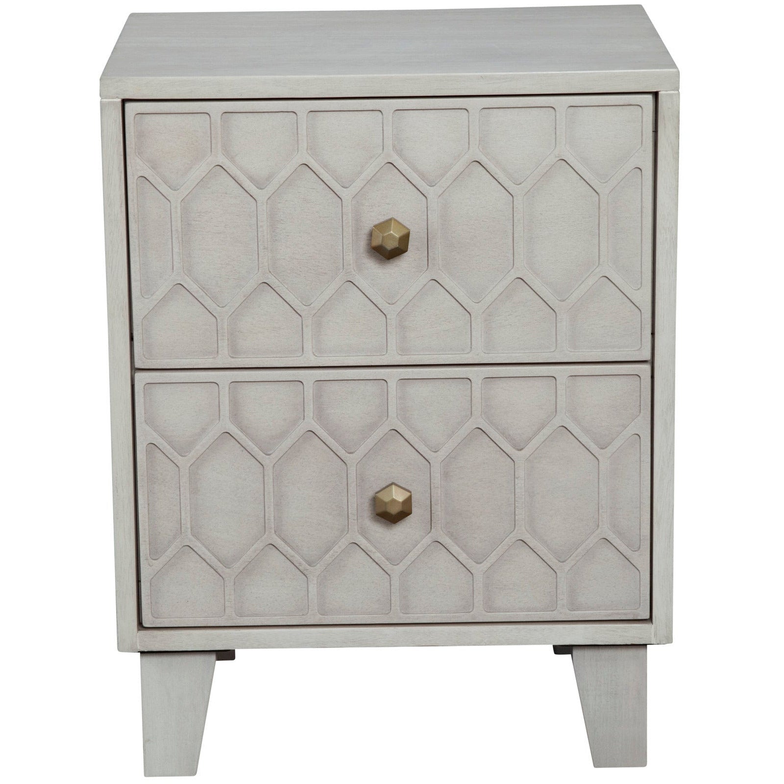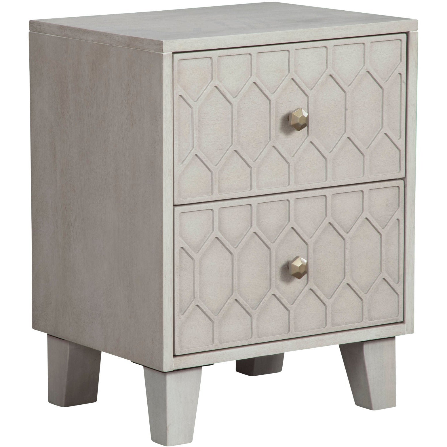 The Denver Two Drawer Nightstand will bring a crisp, natural look to your bedroom while providing a pop of detail with its unique honeycomb design. Crafted from Mahogany solids and veneer, this handmade side table comes fully assembled and features a light grey stain with geometric knobs that add a subtle contrast. This sturdy accent table also includes a felt-lined top drawer and metal ball bearing drawer glides that provide convenience to your storage needs. Whether you love clean lines and minimalist design or the latest styles in farmhouse chic, this well-built nightstand will nestle perfectly in your home.