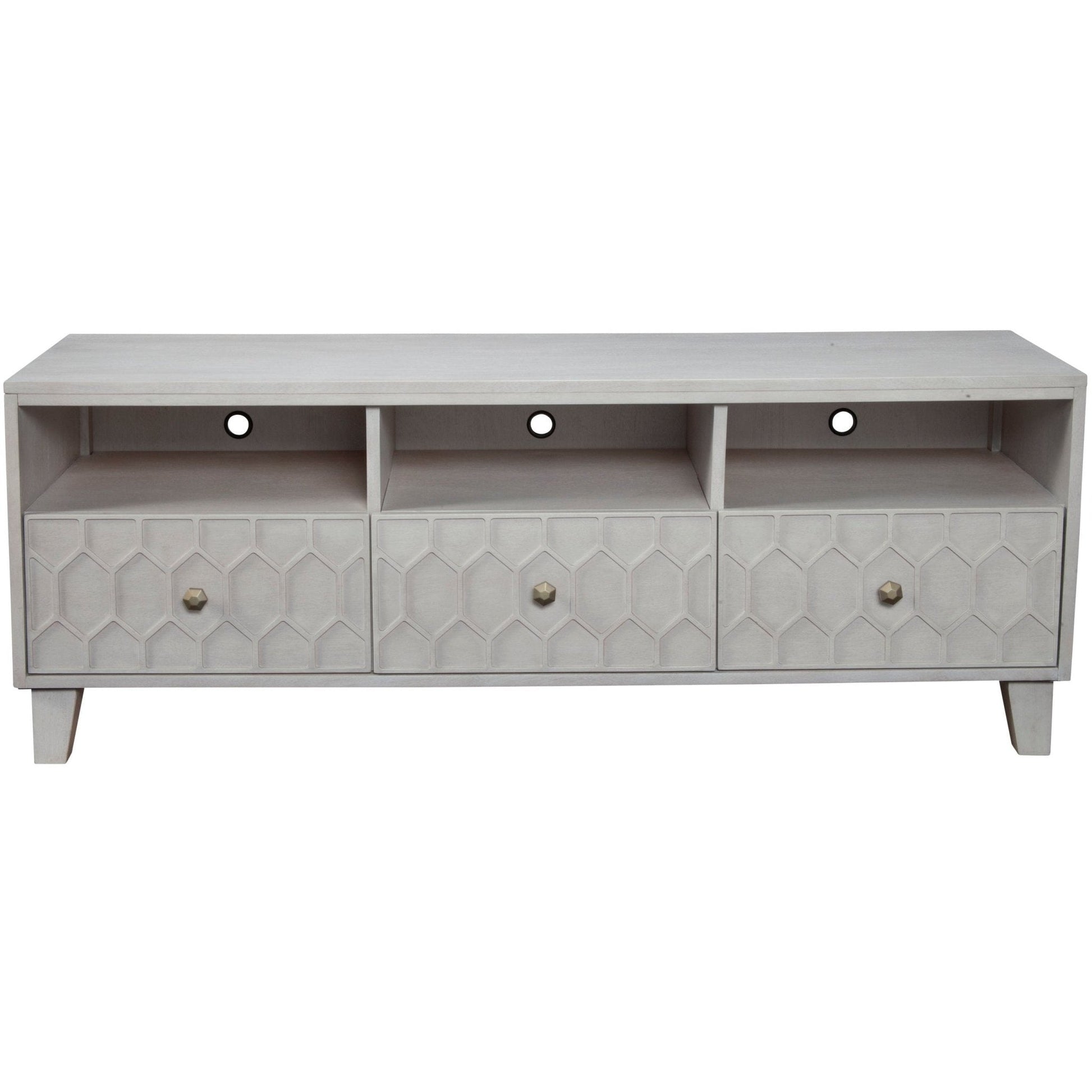 The Denver TV Console is the perfect perch to showcase your entertainment center. This TV stand will bring a crisp, natural look to your living room or bedroom while providing a pop of detail with its unique honeycomb design. Crafted from Mahogany solids and veneer, this handmade TV stand features a light grey stain with geometric knobs that add a subtle contrast. It is fitted with three drawers accompanied by metal ball bearing drawer glides that provide convenience to your storage needs. It is also fitted with three open shelves to store and display anything from your cable box and remotes to your favorite books and magazines. These open compartments also feature discreet holes for wire management. The Denver TV comes fully assembled.