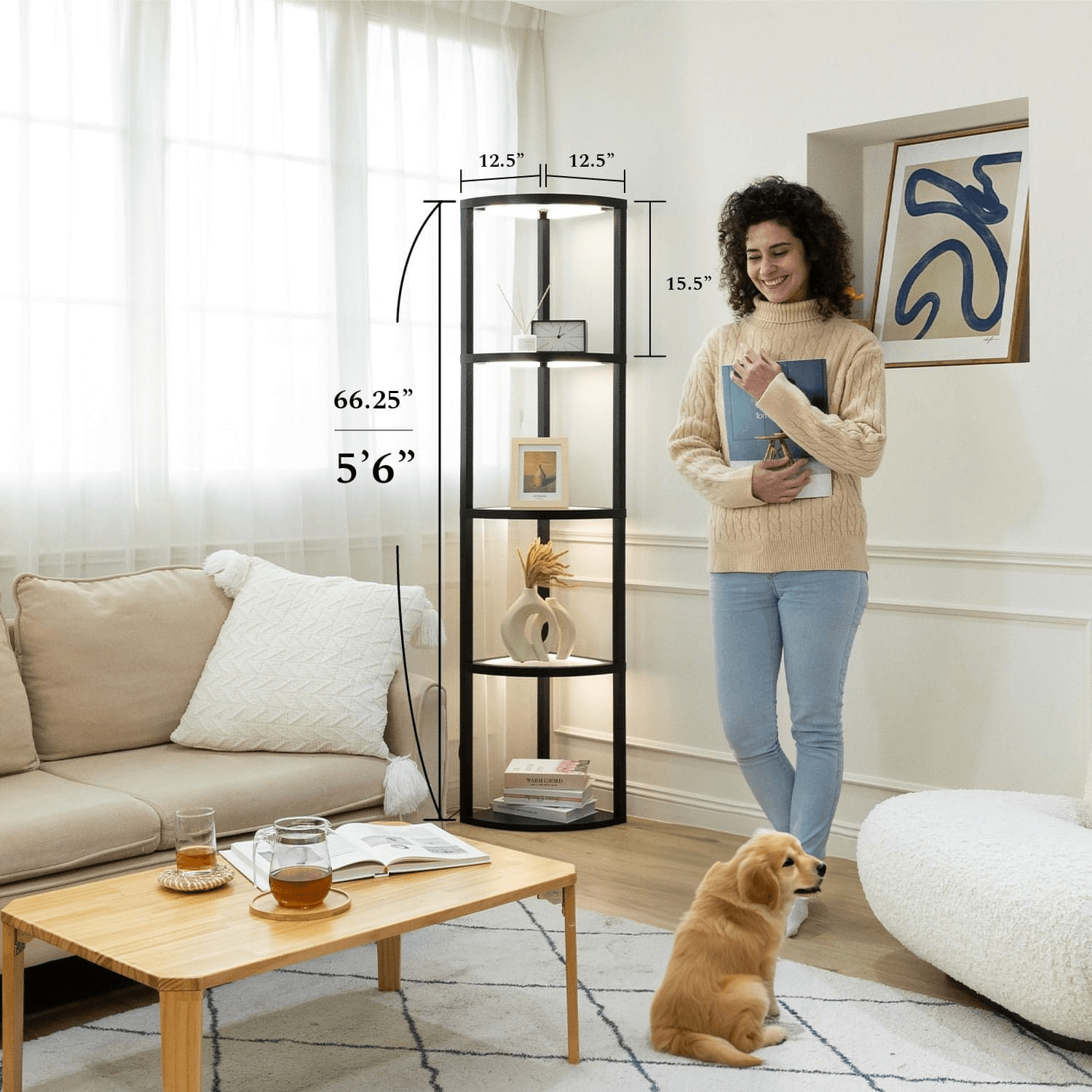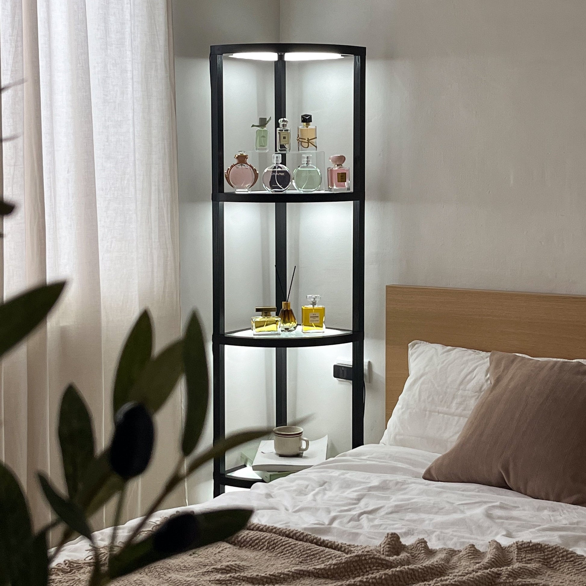 STRONG TEMPERED CORNER GLASS SHELVES: This glass shelf floor lamp is built strong enough to hold up to 60 lbs on each tier, allowing you to show off what matters most to you.