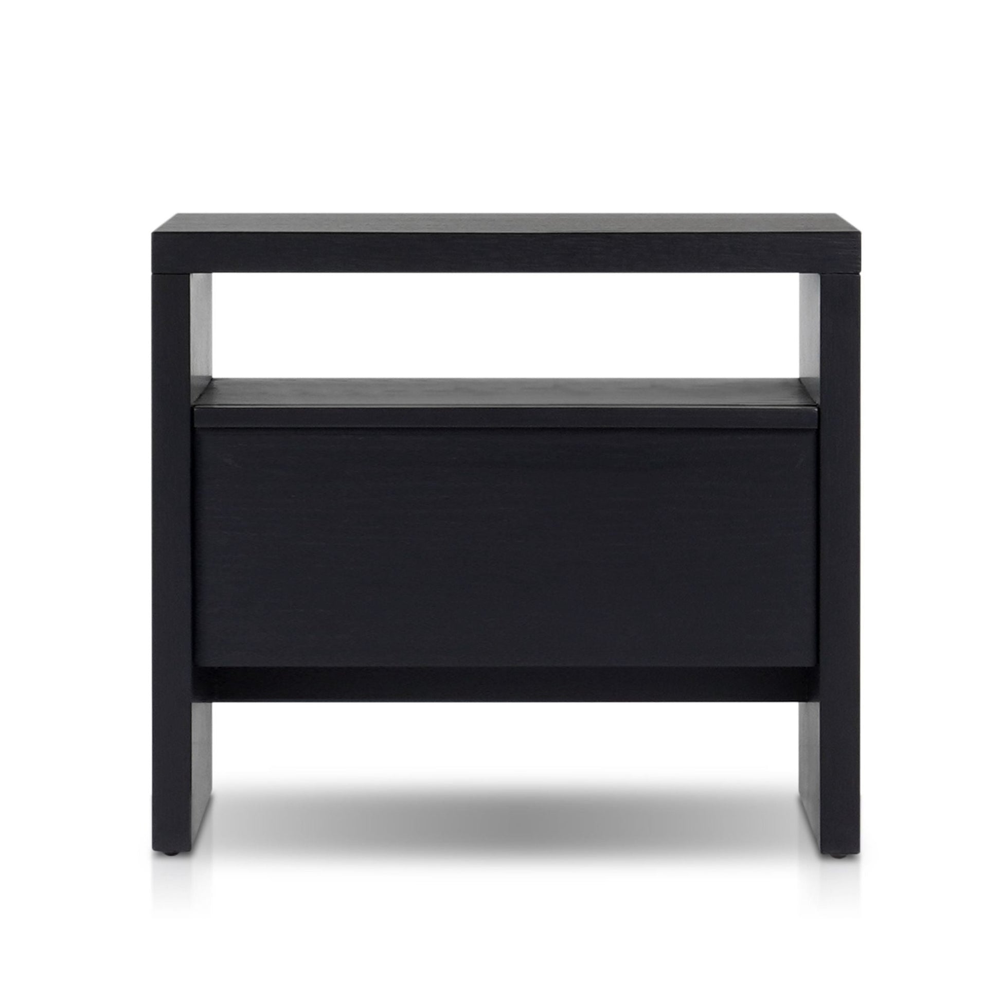 Introducing the Flo Collection Nightstand, a masterpiece constructed with a foundation of sturdy Mahogany complemented by a refined Oak Veneer top, in a black finish. This harmonious blend of materials exudes timeless elegance in your bedroom. Arriving fully assembled for your convenience, this nightstand showcases the innate beauty of wood grains, creating a warm and inviting atmosphere. Its metal ball bearing soft close drawers add a touch of luxury and functionality. Elevate your bedroom decor and experience the best of natural charm and effortless convenience with the Flo Collection Nightstand.