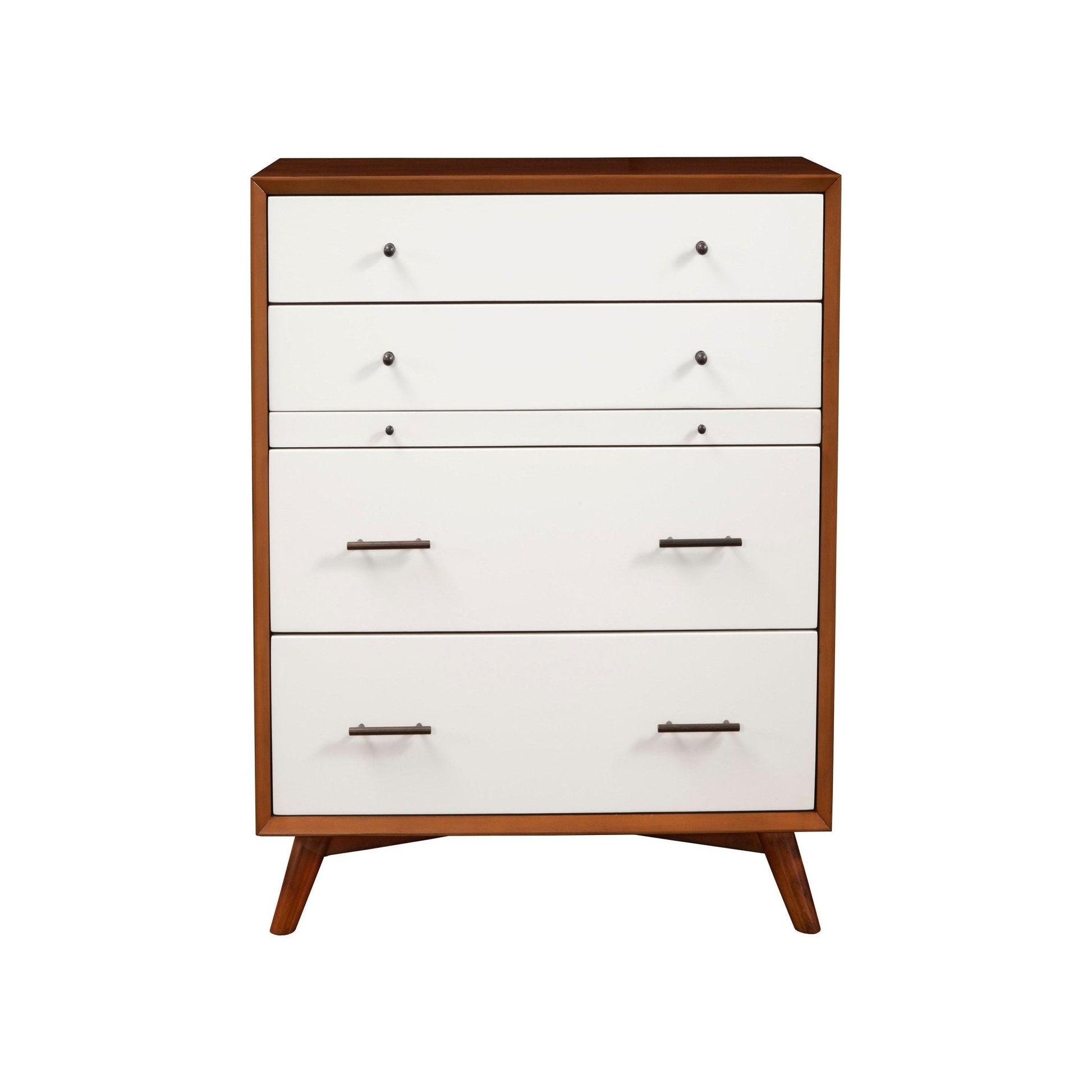 The Flynn collection features the classic lines of Mid-Century Modern furniture that never goes out of style. Its sturdy frames are built to last, constructed of sustainably sourced solid Mahogany solids to ensure a lifetime of use. The Flynn multi-function chest features 4 drawers for storage as well as a functional pull-out shelve. The case pieces in the correlating Flynn bedroom collection all provide a roomy storage solution and make it easy to create a cohesive decorating style or mix and match for a more personalized look. This group combines the Chestnut and White finishes for a great looking two-tone option.