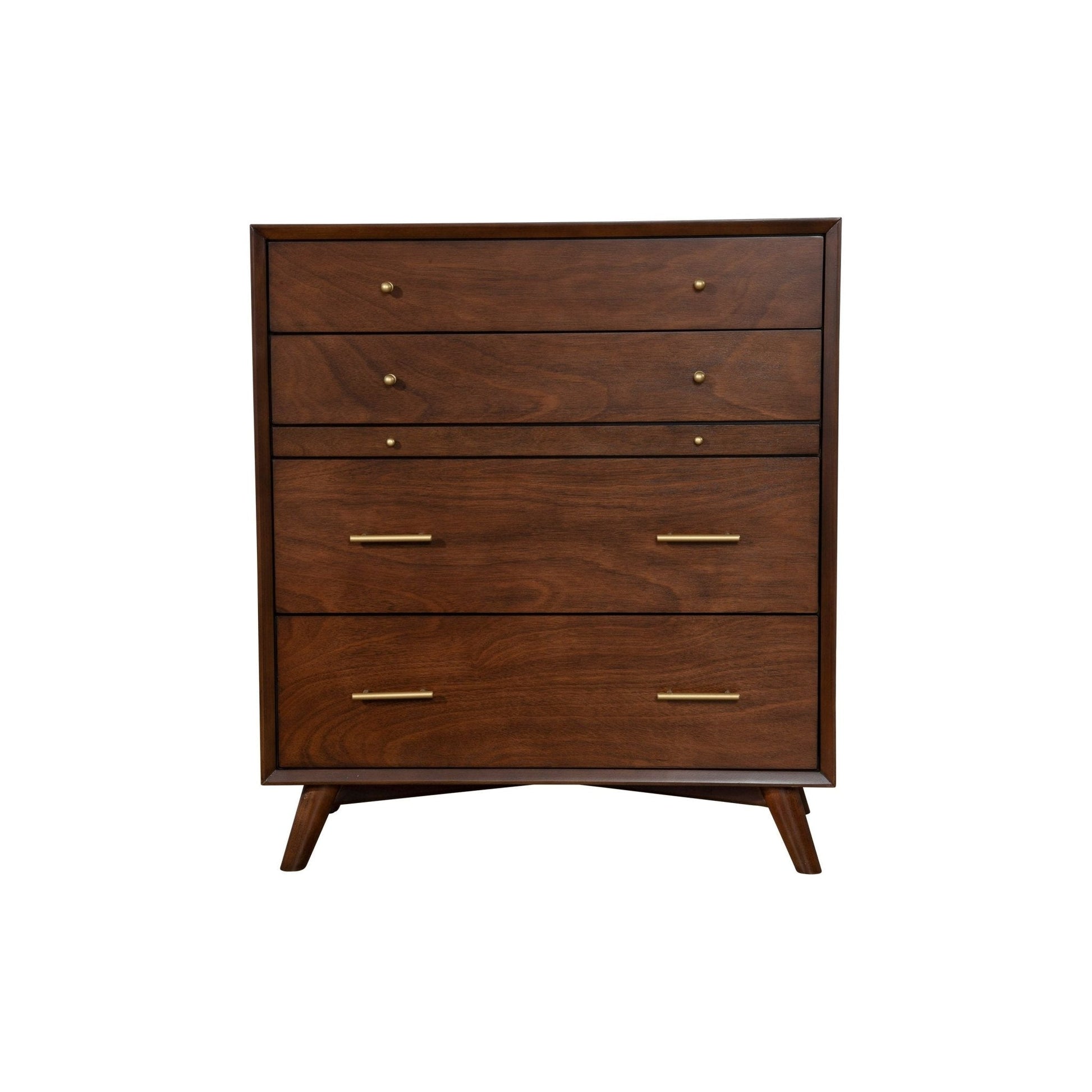 The Flynn collection features the classic lines of Mid-Century Modern furniture that never goes out of style. Its sturdy frames are built to last, constructed of sustainably sourced solid Mahogany to ensure a lifetime of use. The Flynn Accent Chest has four drawers to accommodate most extra storage needs. The dresser comes fully assembled, and is constructed with ball bearing metal drawer glides and French & English dovetail drawer construction. The Flynn bedroom makes it easy to create a cohesive decorating style or mix and match for a more personalized look. Coordinates with other pieces in multiple finish options as part of the Alpine Furniture Flynn collection sold separately.