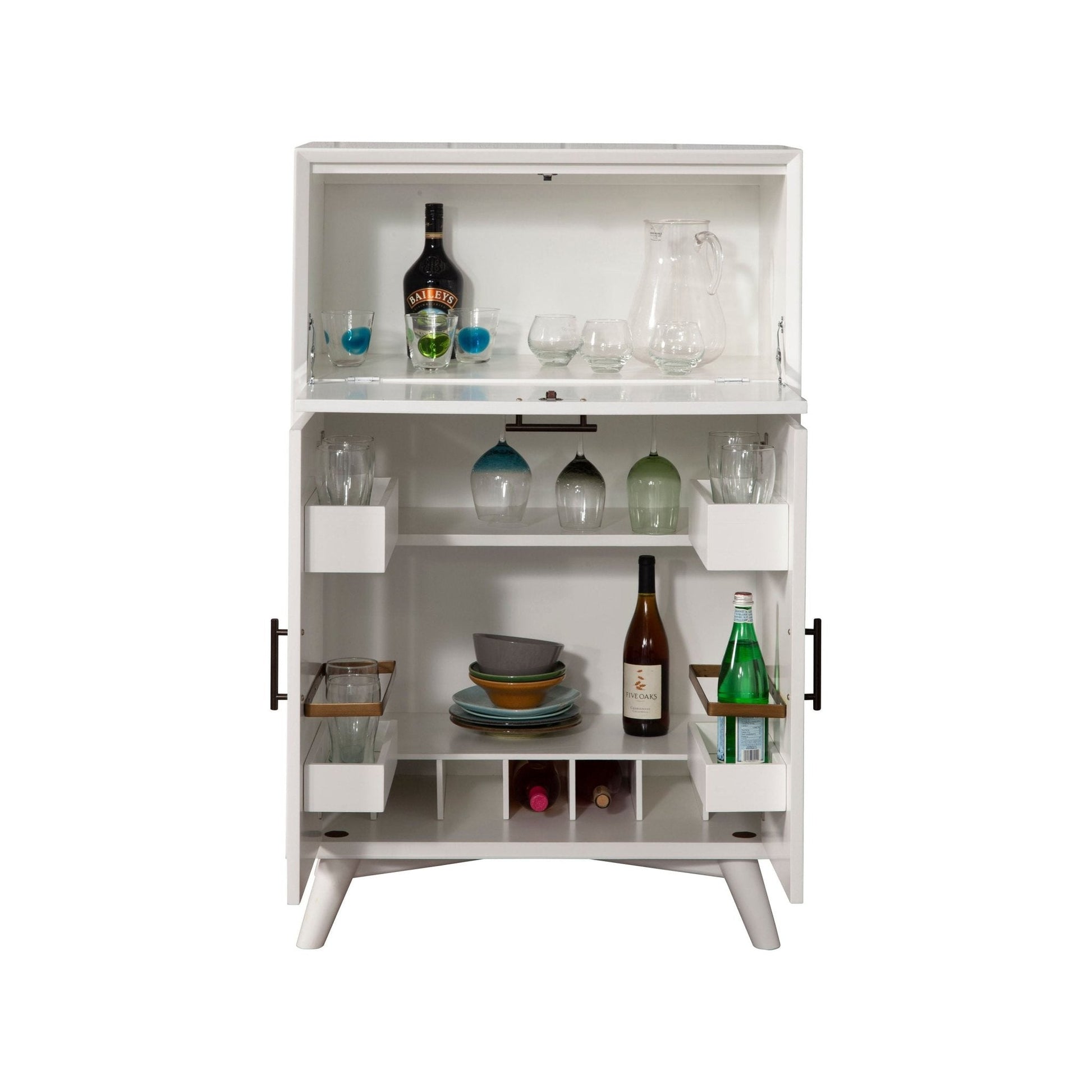 The Flynn Bar Cabinet is the perfect storage solution for mixing and serving beverages. It features a pull-down tray and two levels of storage for liquor bottles and wine glasses. Its sleek, contemporary design adds style and elegance to any entertaining space.