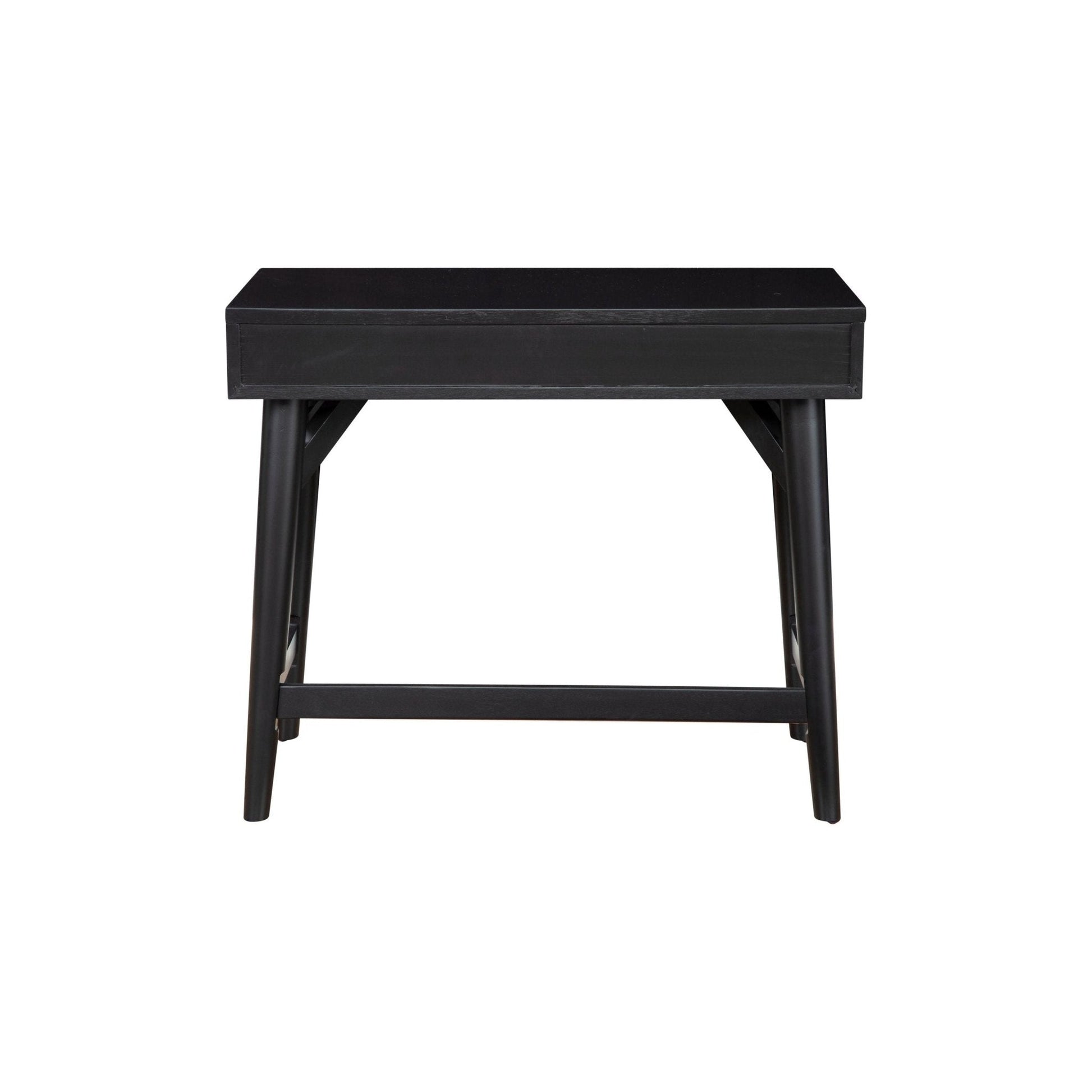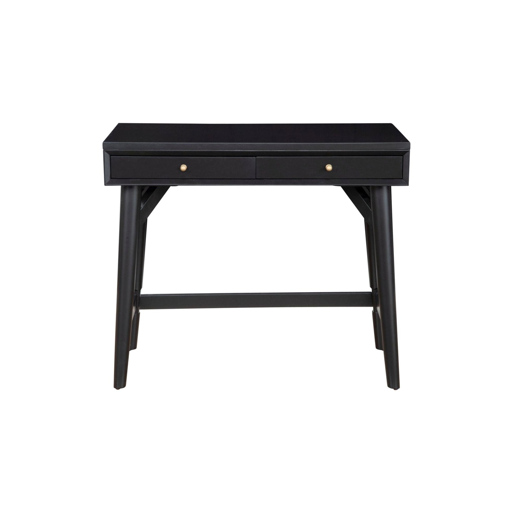 Influenced by Mid-Century design, the Flynn 2-Drawer Desk combines clean-lines and tapered legs for a distinctive look. Featuring Mahogany wood solids and Okume veneer, use this piece to anchor your home office in sophisticated style. Finished in a timeless black, the drawers are felt lined and have accent hardware. Mix and match with other pieces from the Alpine Furniture Flynn collection.