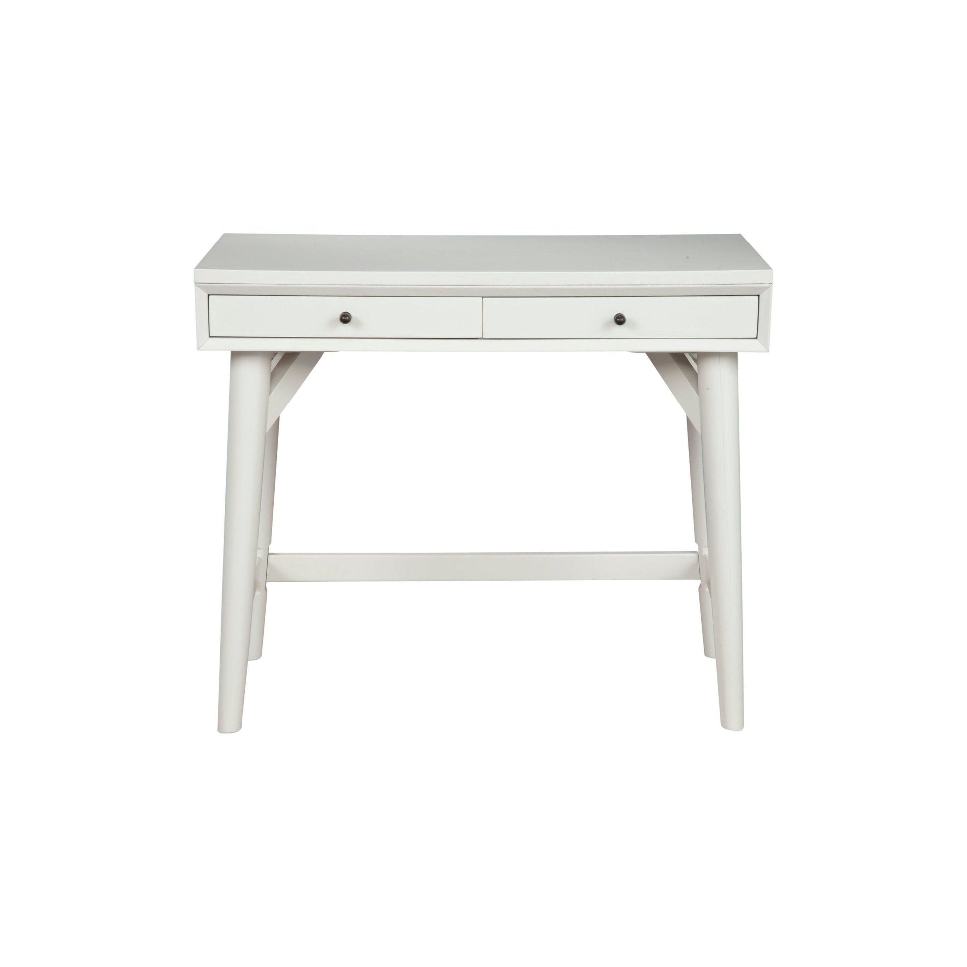 Influenced by Mid-Century design, the Flynn 2-Drawer Desk combines clean-lines and tapered legs for a distinctive look. Featuring Mahogany wood solids and Okume veneer, use this piece to anchor your home office in sophisticated style. Finished in a beautiful white color, the drawers are felt lined and have accent hardware. Mix and match with other pieces from the Alpine Furniture Flynn collection.