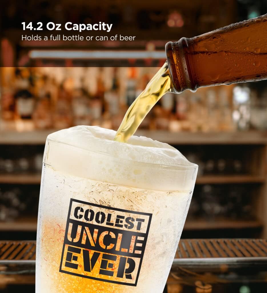• The ultra durable double walled beer mug has a 14.2-ounce capacity - enough for a full bottle of beer. (Hand wash, not microwaveable)