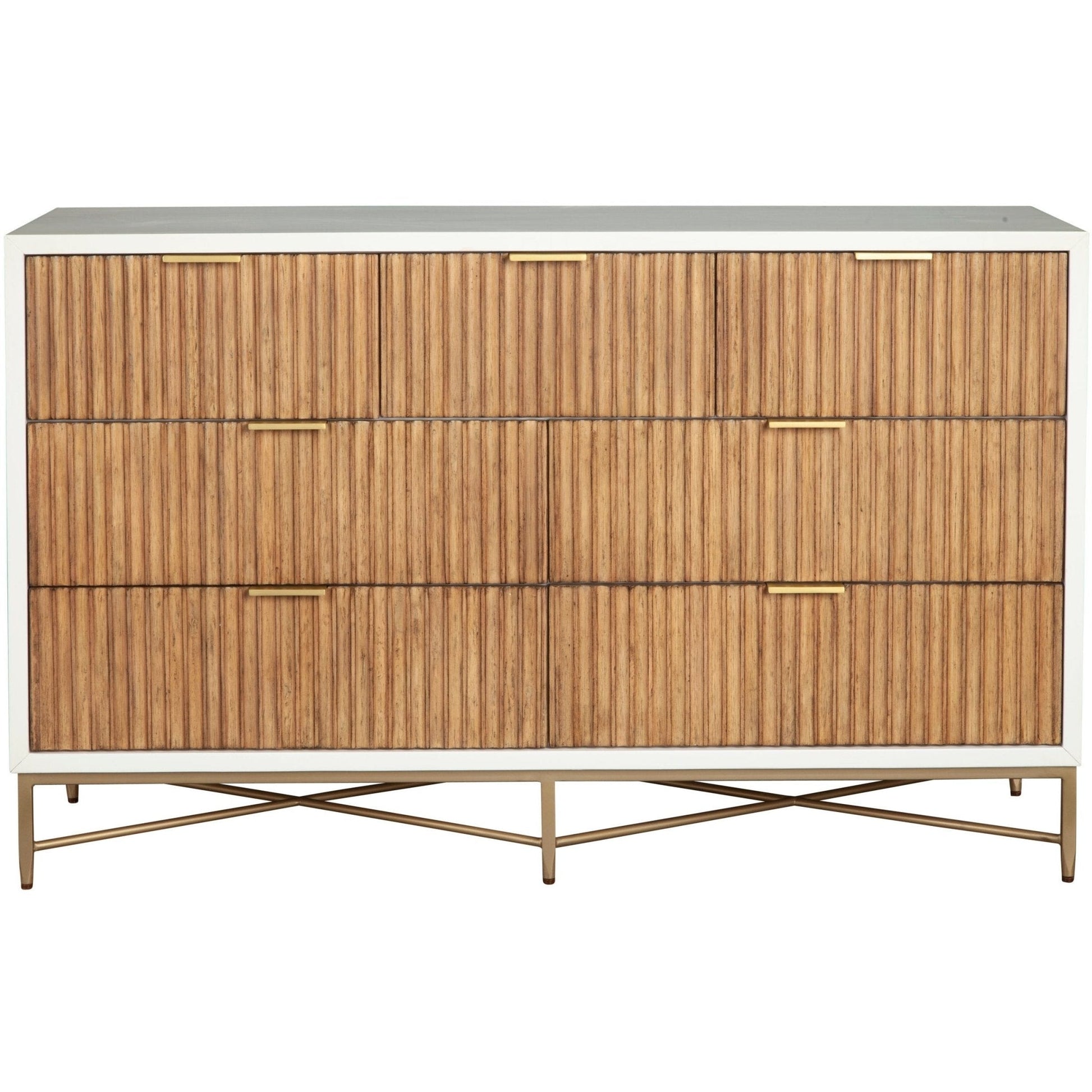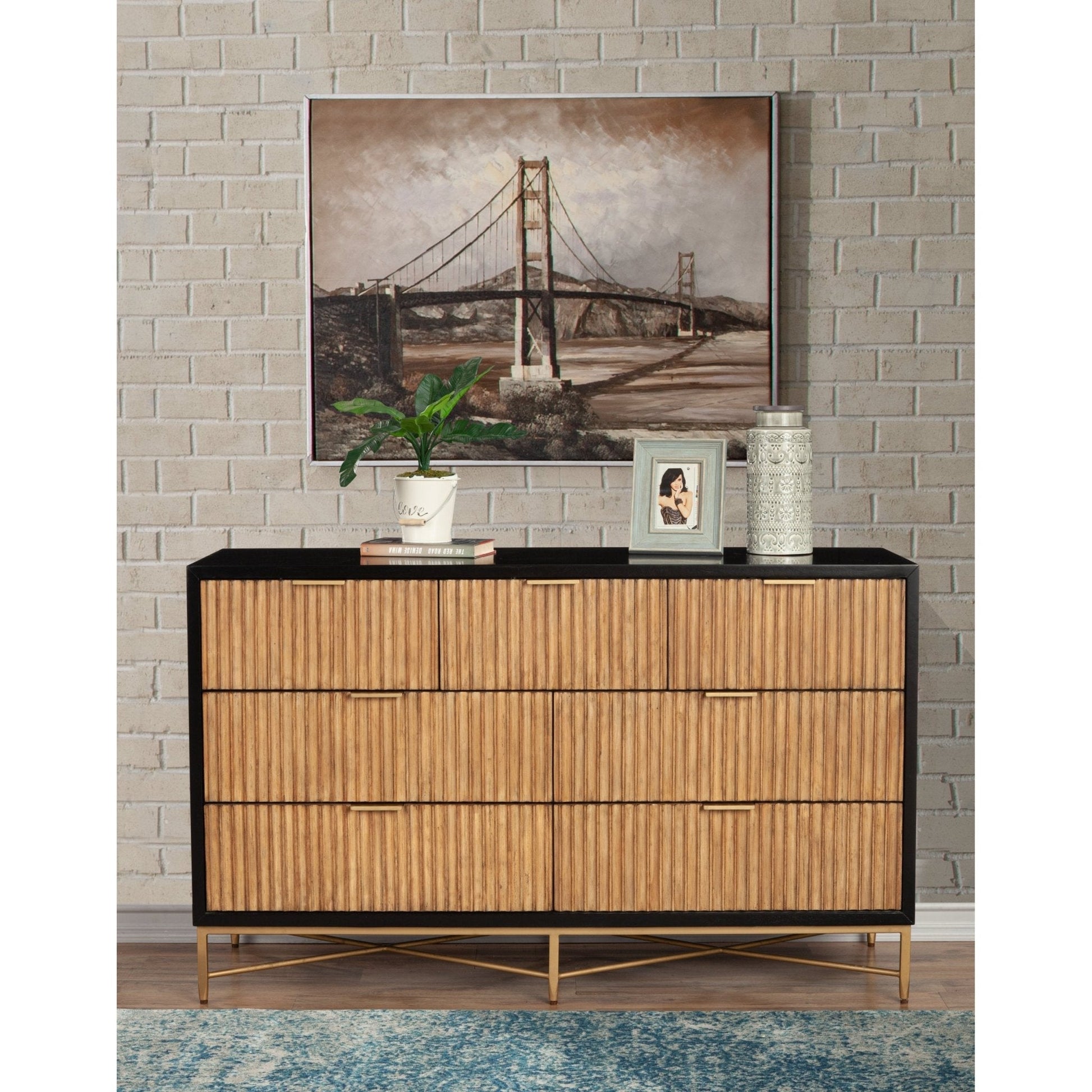 The Larsen Dresser adds a touch of elegance to any bedroom. Crafted with seven drawers and gold accent legs, this dresser exudes a sophistication only accentuated by its gold hardware and English dovetail drawer construction. Enjoy an effortless experience every time you open your drawers, thanks to the metal ball bearing glides, and keep your delicate items safe with a felt-lined top drawer. Fully assembled and ready to use, the Larsen Dresser is a timeless addition to your home.