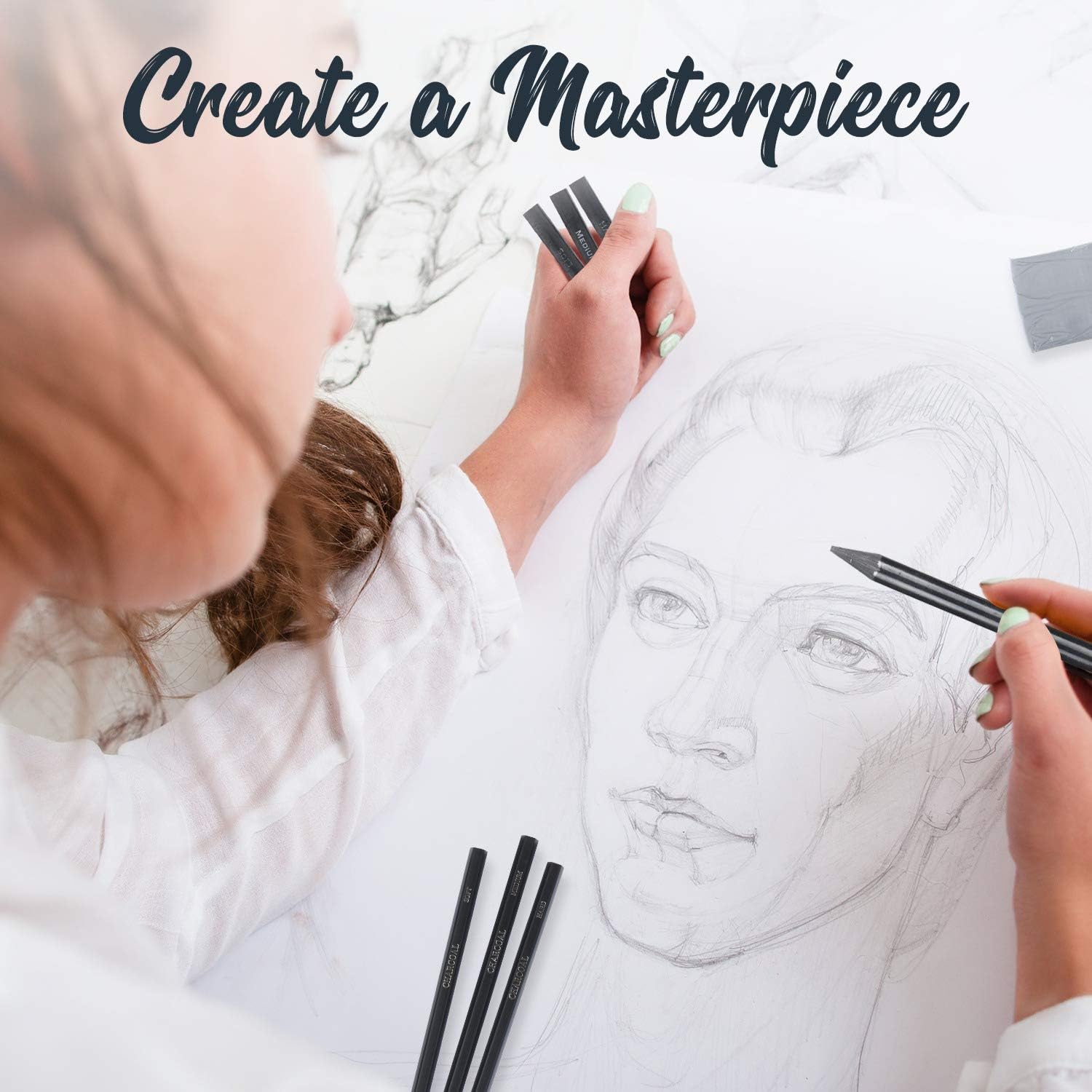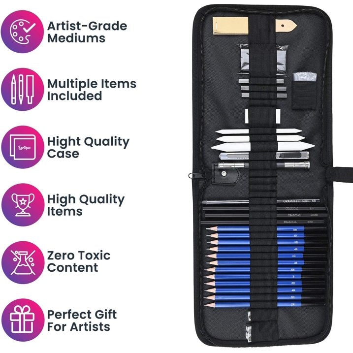 - Complete Professional Art Kit: Lartique’s 32-piece drawing kit includes 12 graphite pencils, 3 charcoal pencils, 3 charcoal sticks, 3 graphite sticks, 1 woodless graphite pencil, art knife, pencil extender, 1 kneaded erases, 1 vinyl eraser, 1 tortillons and 2 sharpeners.