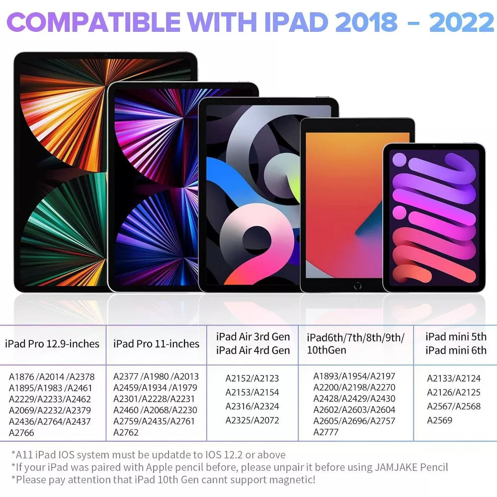 Compatible with 2018-2024 iPad & iPad Pro:The stylus supports for iPad series 2018-2024 model: iPad 10th/9th/8th/7th/6th Gen, iPad Air 3rd/4th/5th Gen, iPad Pro 11 inches,iPad Pro12.9 inches 3rd/4th/5th/6th,iPad Mini 5th/6th Gen. Please confirm your devices before you order..