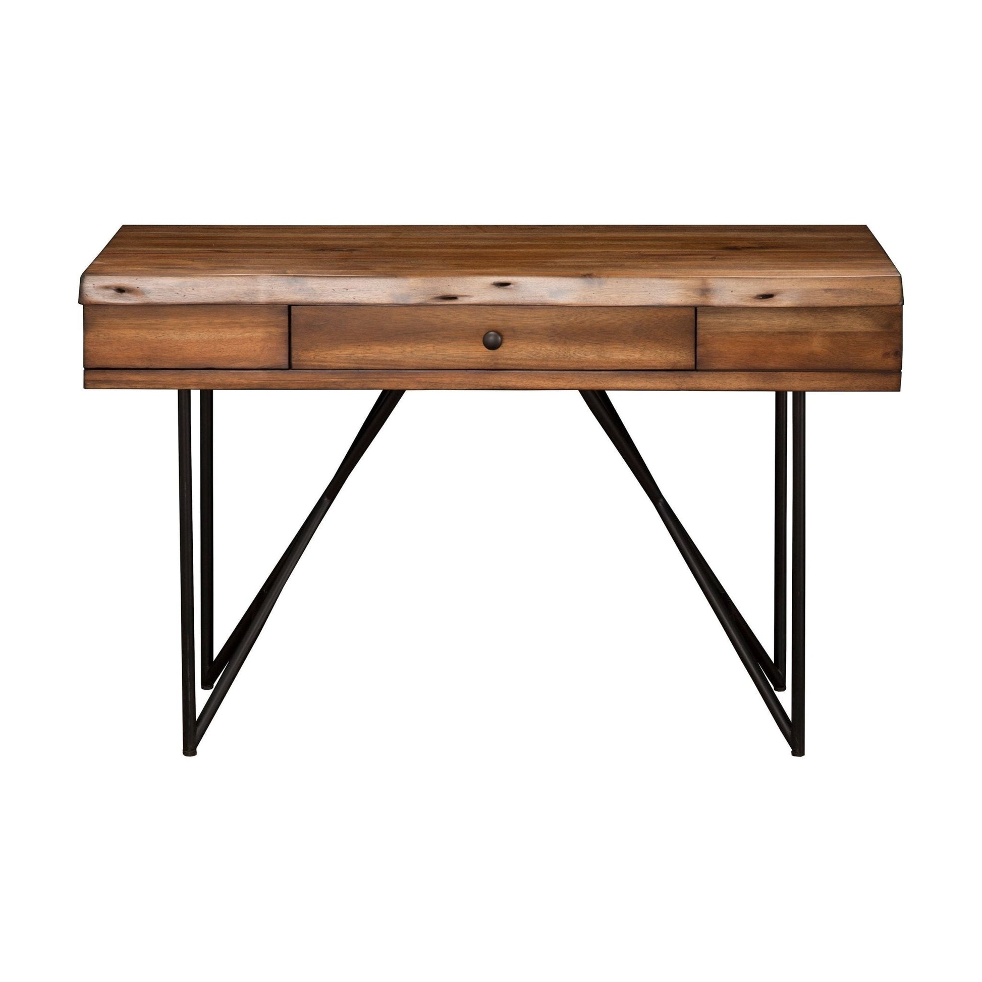 Spectacularly simple, the Live Edge Collection brings together form and function in these industrial-inspired pieces. Writing desk features one drawer for storage. Choosing sustainable wood resources, this group incorporates Acacia wood, metal legs that give stable support with a floating feel, with a warm walnut (brown) finish.