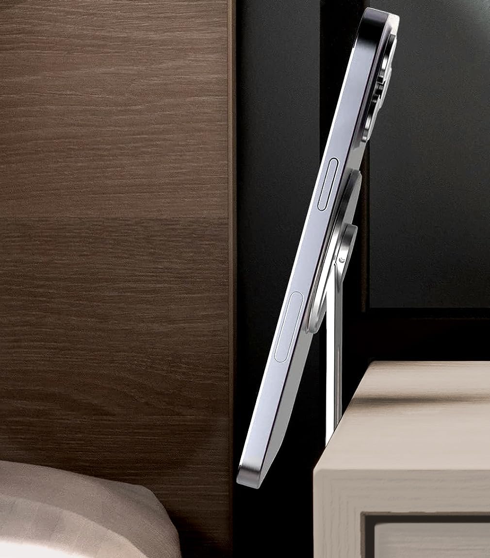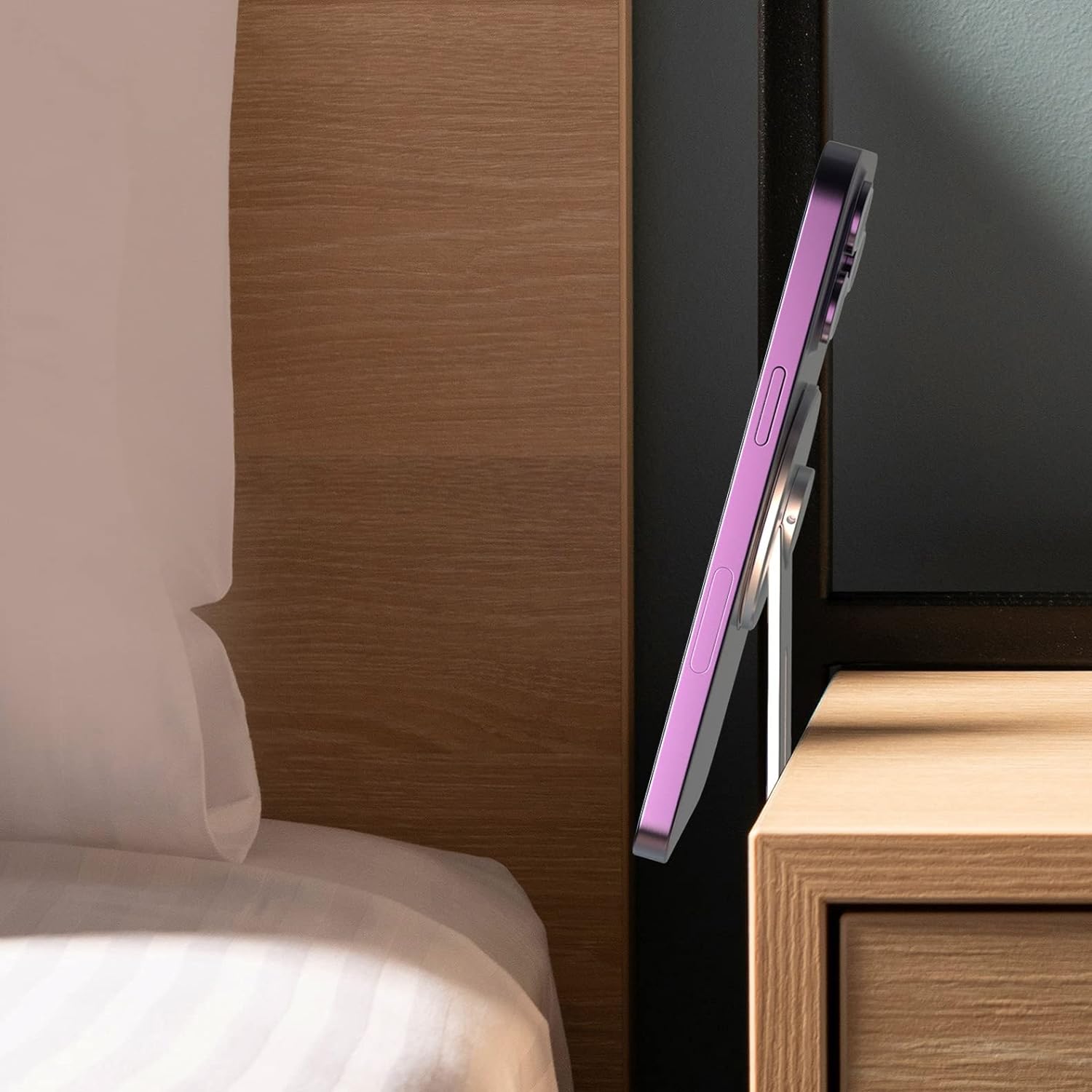 Magnetic Phone Holder, Fold-Away Swivel Stand Compatible with MagSafe for iPhone 12, 13, 14, 15 Pro Max | Bedroom Nightstand, Desk, Kitchen and More (Low Profile Sidemount/Under-Mount)