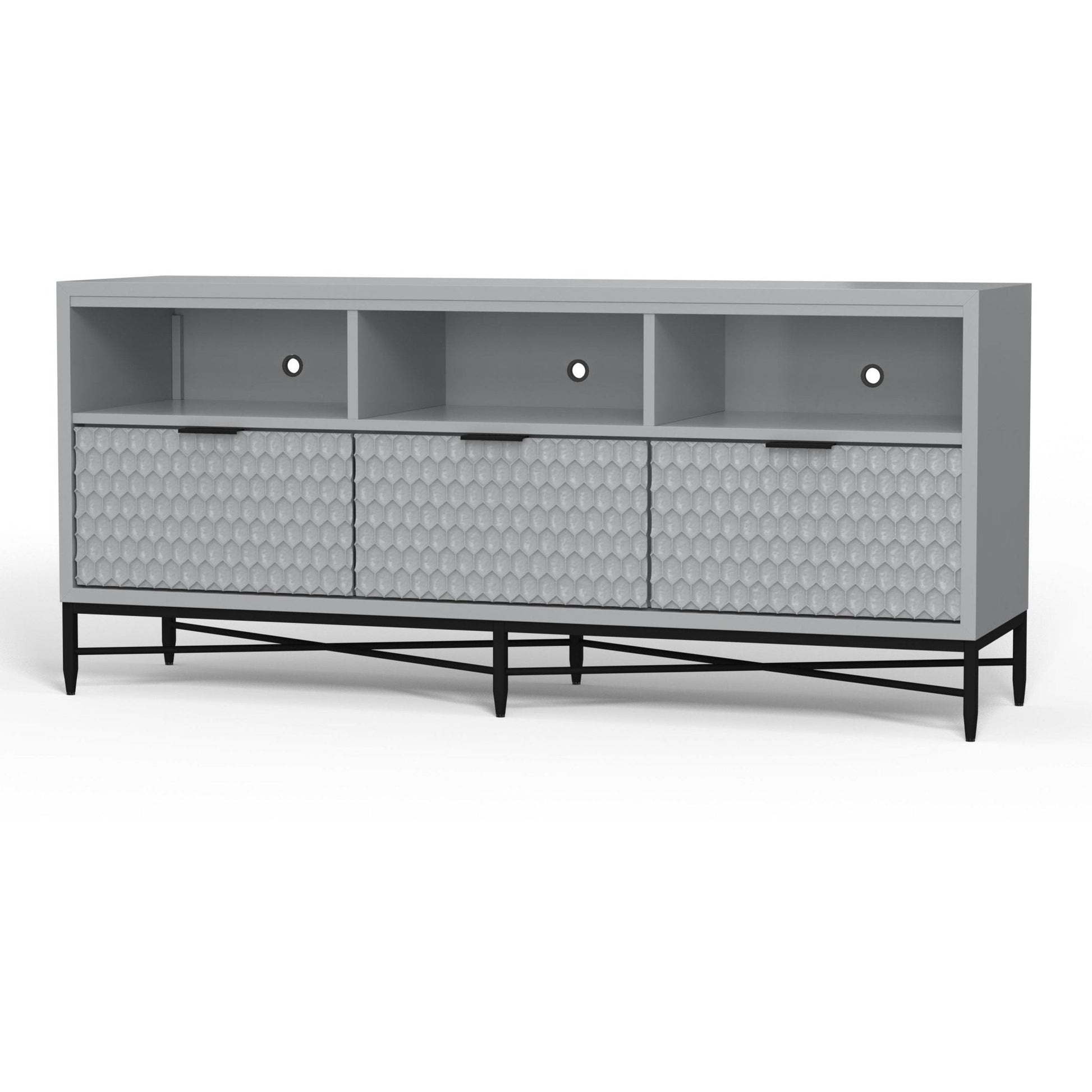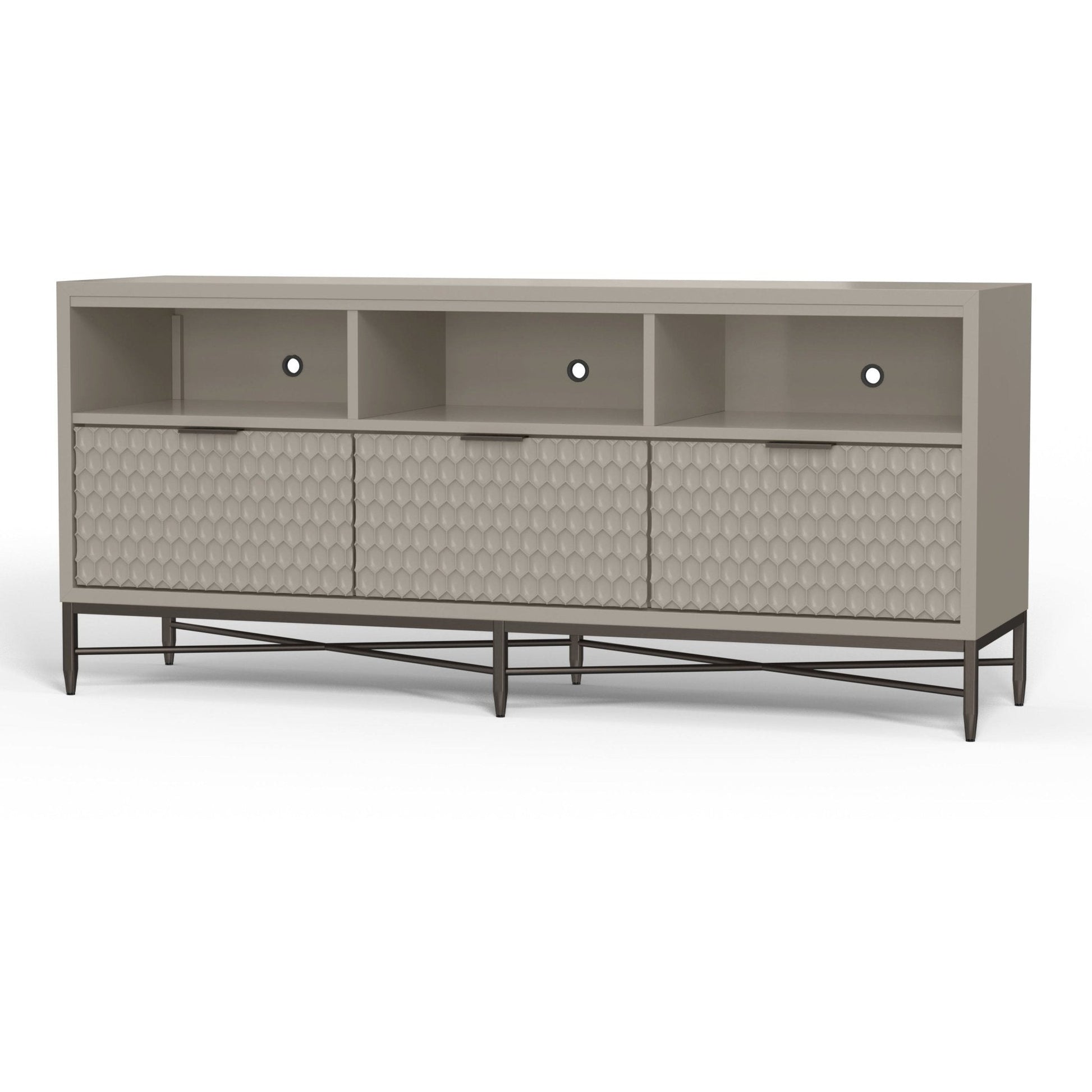 Contemporary fashion, the Milo TV Console combines clean lines with multiple materials. The textured drawer fronts are great looking, bordered by Mahogany solids and veneers, in a pleasing light slate grey finish that makes decorating easy. The piece is accented by pewter metal drawer handles and pewter metal base which gives it an open, off-the-floor look and simplifies cleaning. There is ample storage with 3 drawers and 3 open shelves.