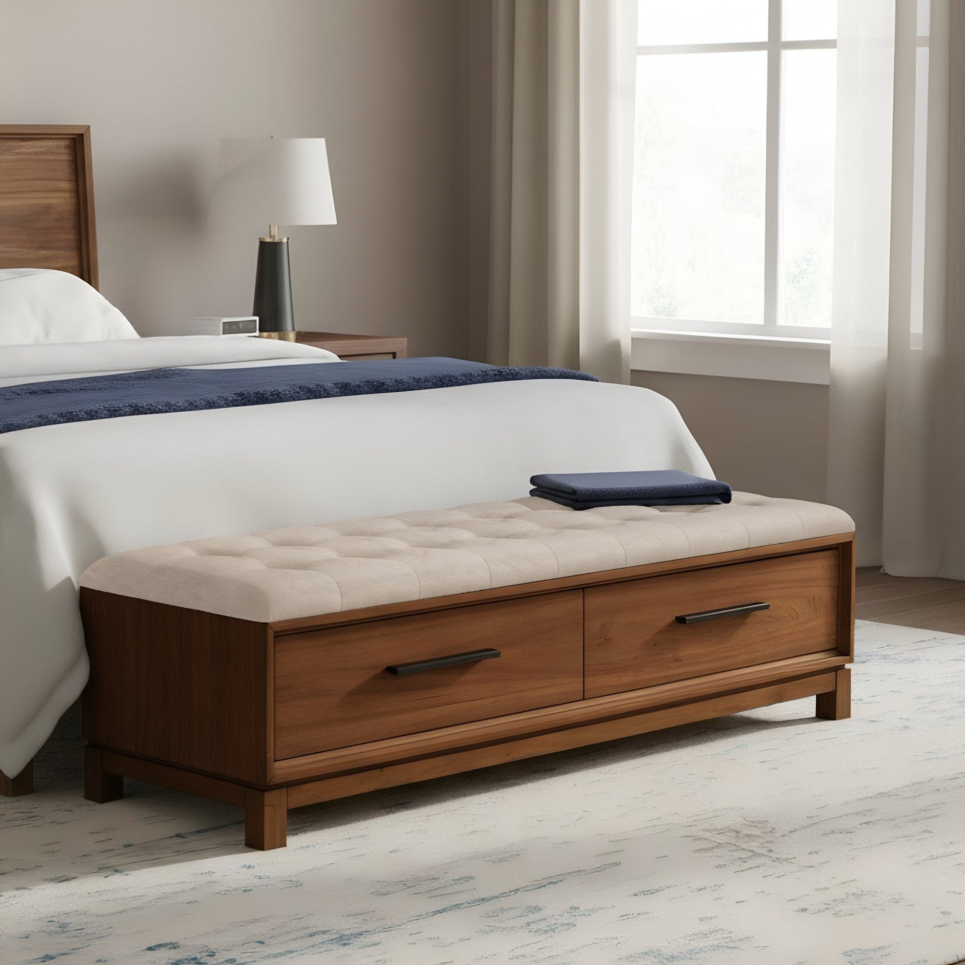 The Nova Bench radiates sophisticated and modern elegance with its two drawers, finished with bronze hardware and metal ball bearing drawer glides. Crafted with English Dovetail construction for enhanced durability, this fully assembled piece is the perfect addition to any luxurious living space.