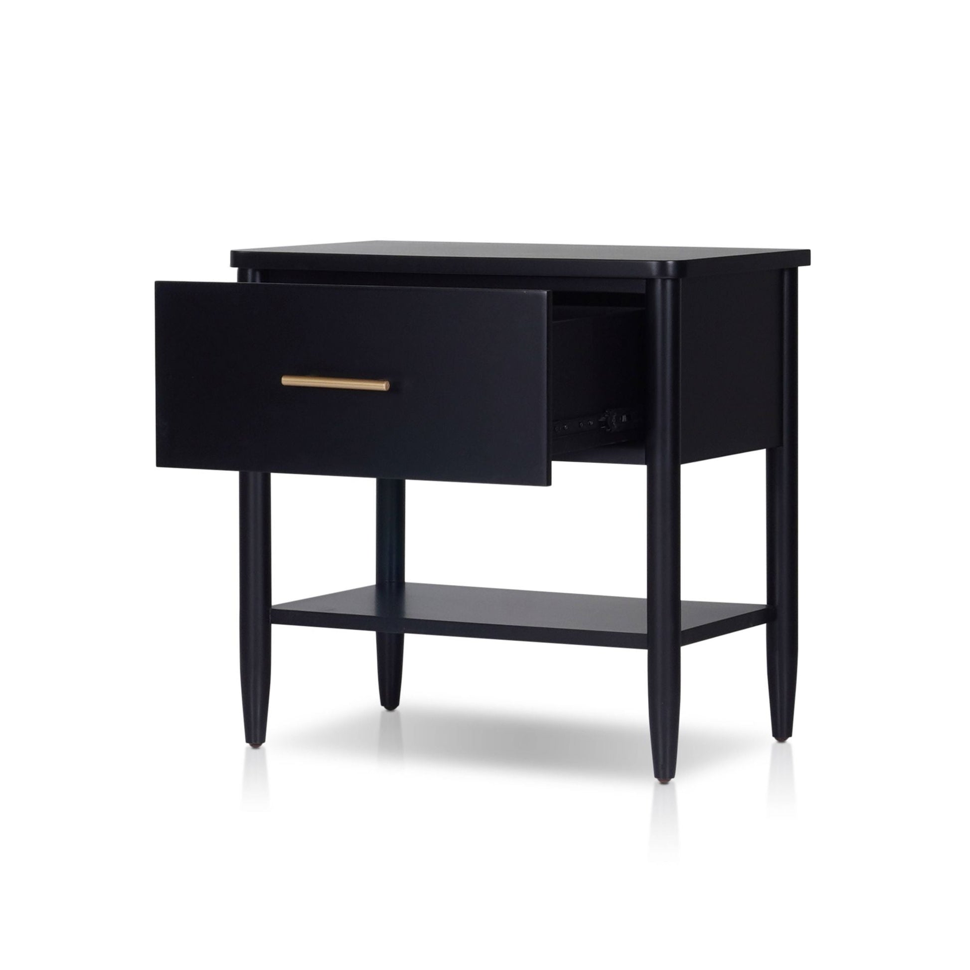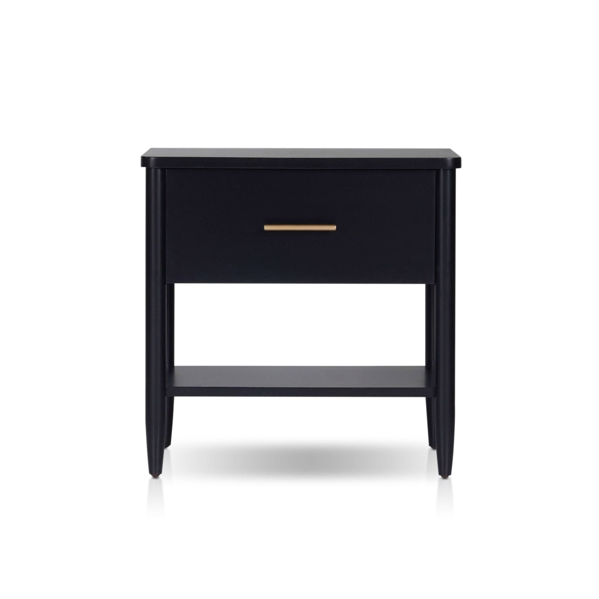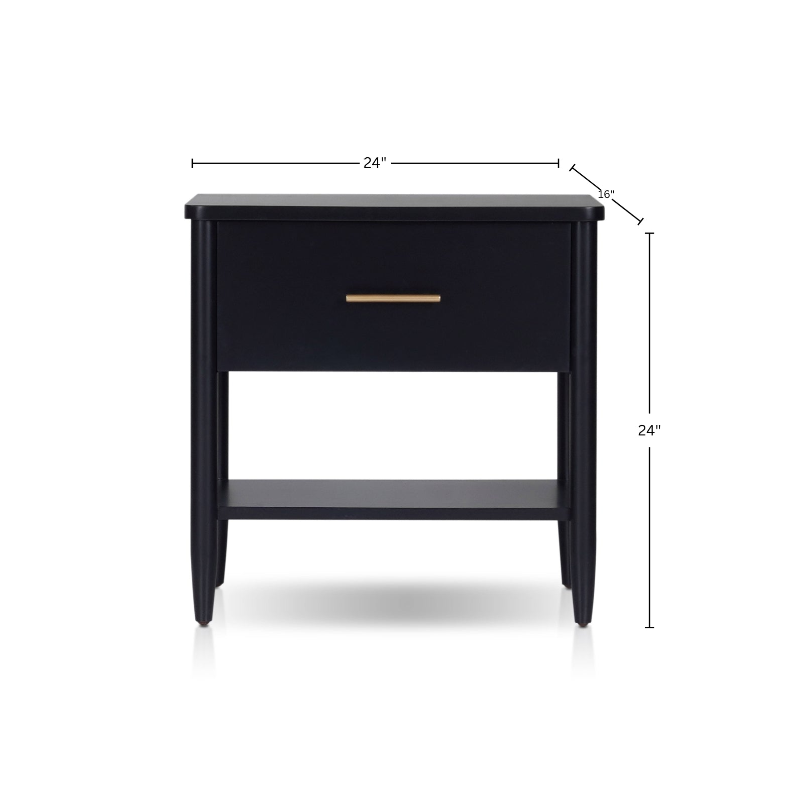 The Paola Nightstand in Black is a sleek and functional piece designed for those who value simplicity. Its soft-close ball bearing drawer glides and fixed shelf make it a practical choice, while the single drawer provides hidden storage. Fully assembled with English dovetail construction, this nightstand is ready to complement any bedroom décor.