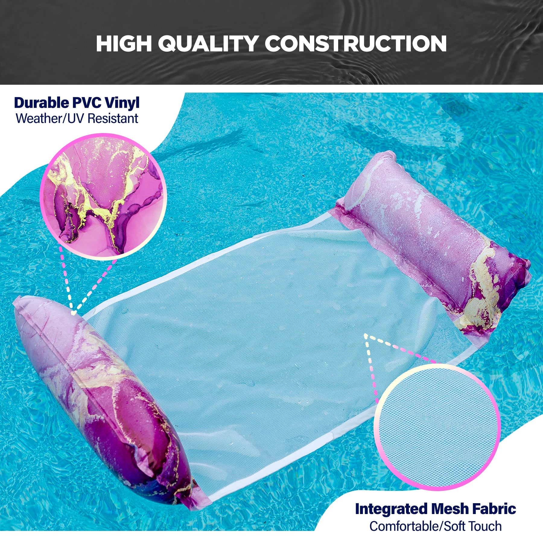Constructed of comfortable mesh and soft-touch vinyl for lasting durability and comfort. Weather/UV Resistant PVC Vinyl construction.