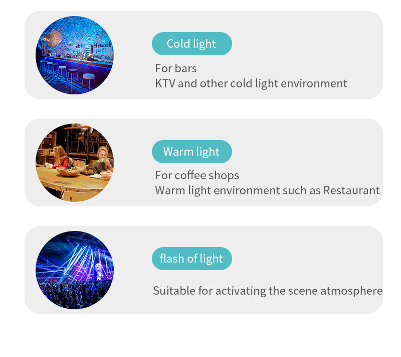 - 2. Cold light/white light: suitable for bar KTV, etc.