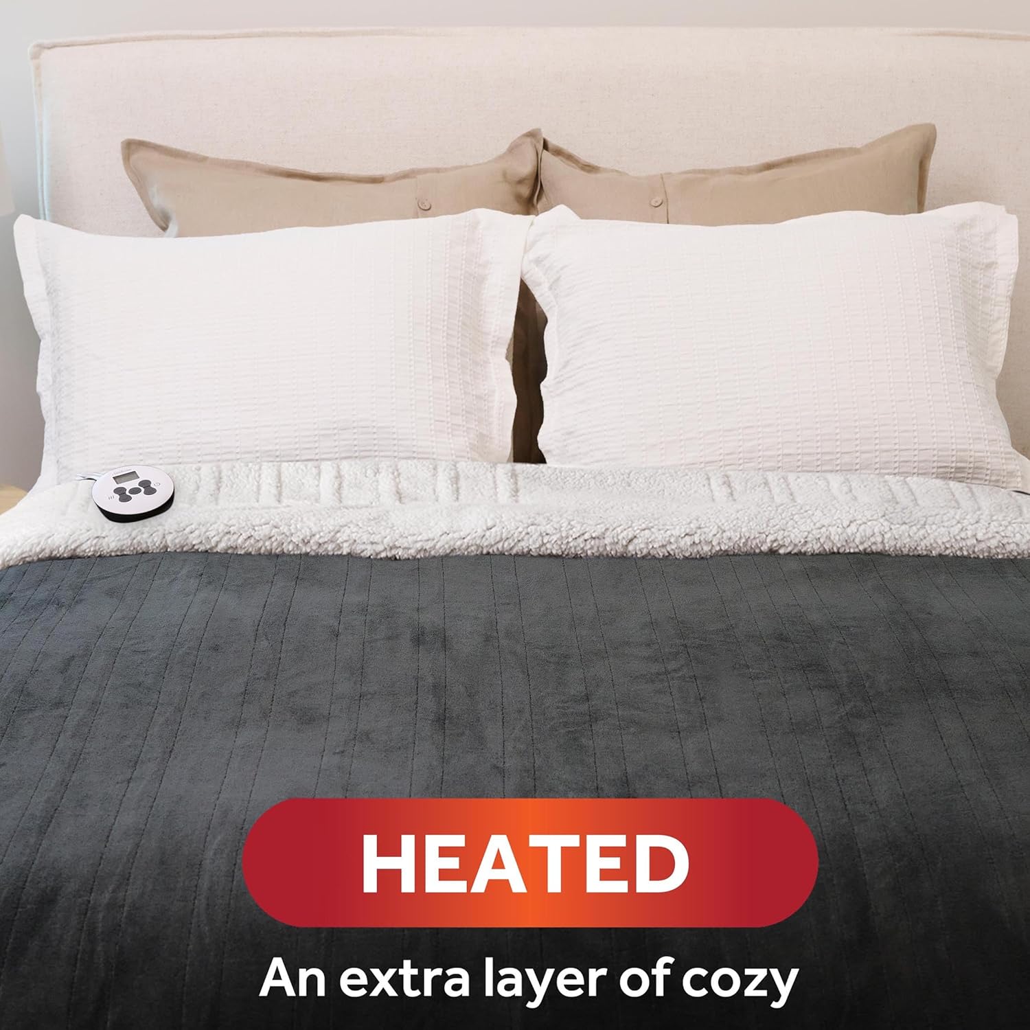 Wrap yourself in warmth and luxury with the Sunbeam Royal Luxe Sherpa Heated Blanket in Night Fog. This twin-sized blanket features a soft, plush Royal Luxe Microplush on one side and cozy Sherpa on the reverse, making it perfect for chilly nights. The digital controller offers 12 heat settings, so you can find your ideal comfort level, along with a 12-hour auto shut-off for worry-free use. The rich, dark grey color adds a touch of elegance to any room, and the blanket is machine washable and dryer safe for easy care.