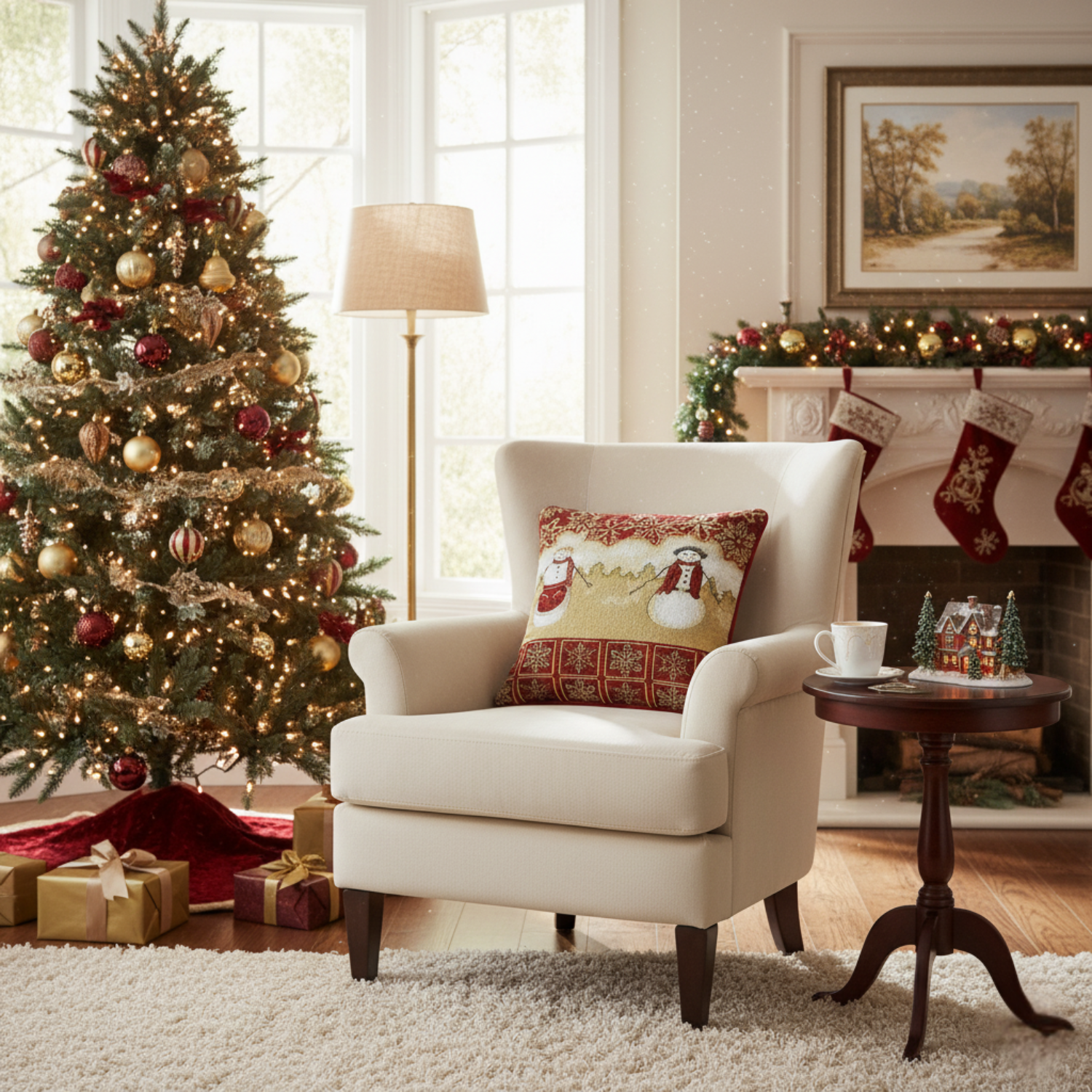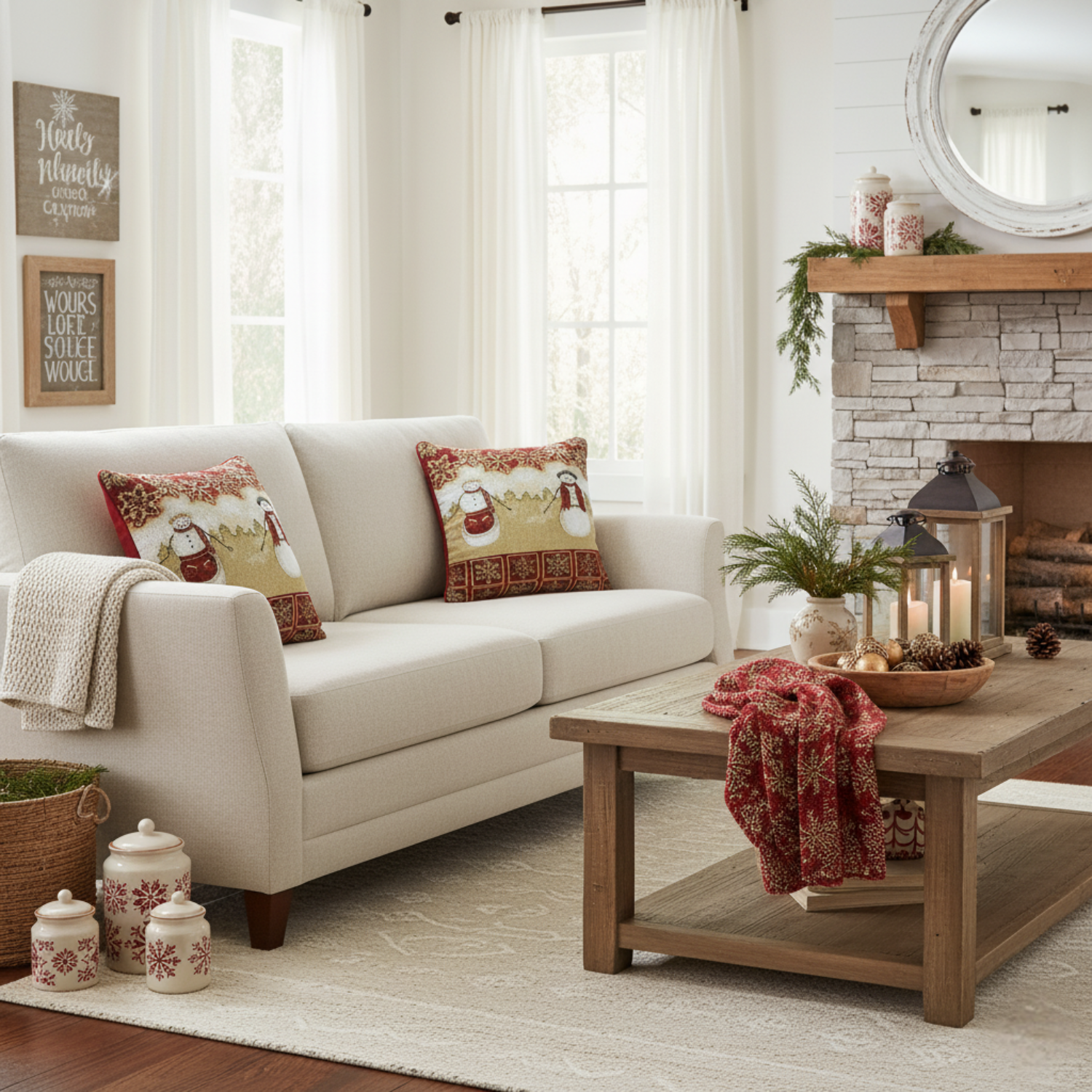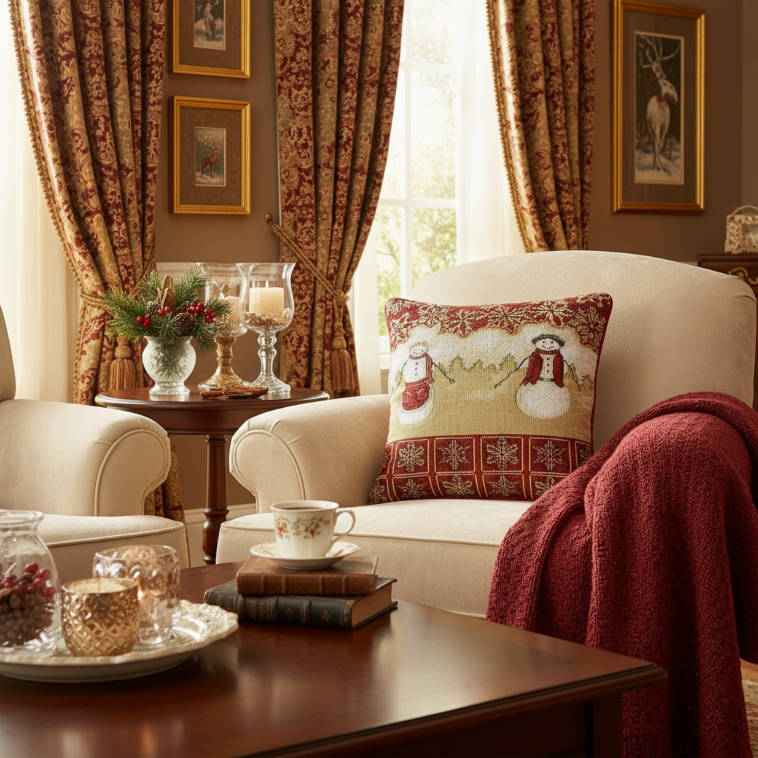 Invite the snowman couple to surely bring in the joy of winter with our Mr. and Mrs. Snowman cushion cover. This design will look great for an antique, traditional style home living room. Use this traditional vintage festive pillow cover to liven up your winter Christmas home decoration. This cushion cover features a snowman and woman in the center of a snowy field, all surrounded by snowflakes. Tapestry/needlepoint style made with sturdy woven fabric will last you for many seasons to come.