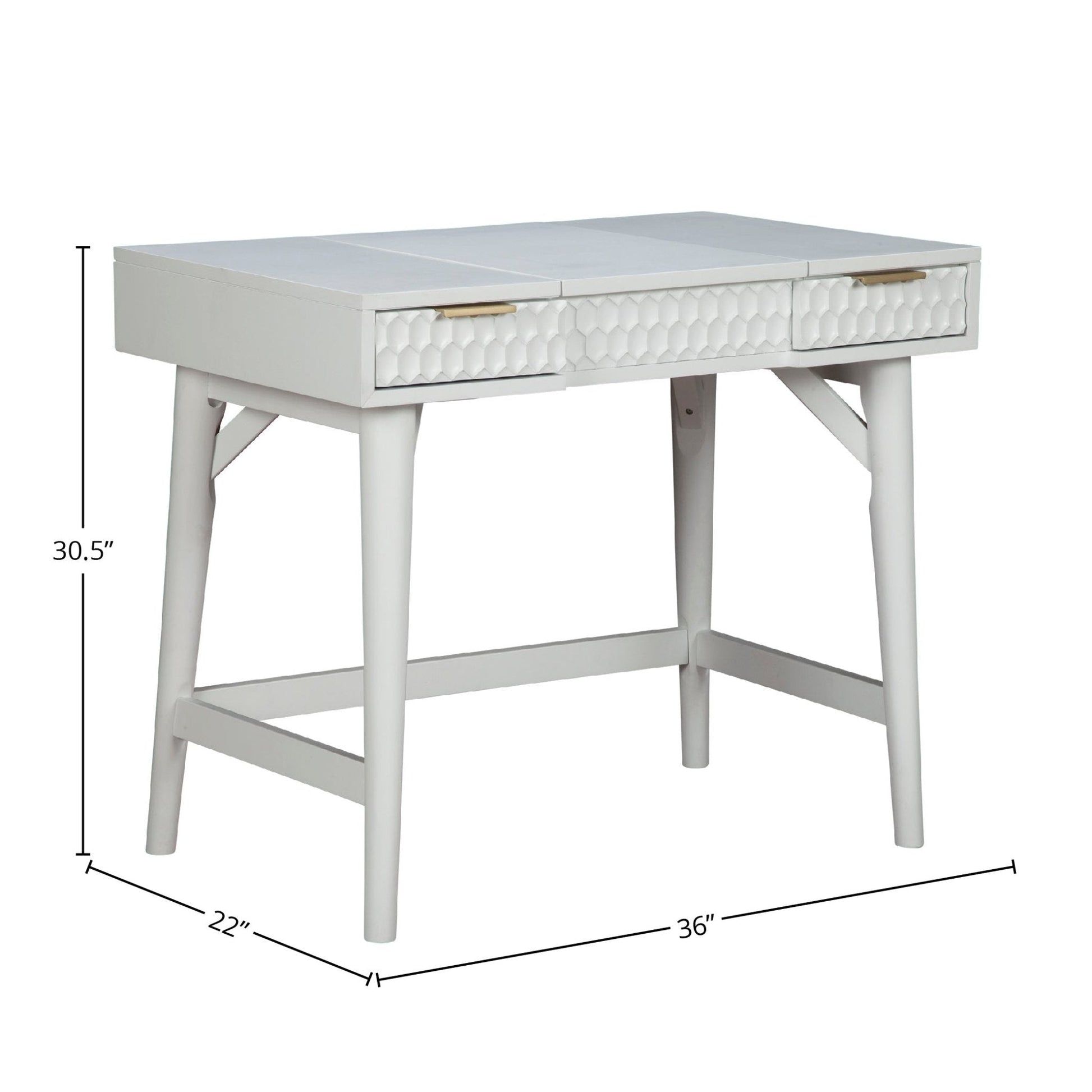 Contemporary fashion, the White Pearl wood bedroom vanity combines clean lines with multiple materials. The textured drawer face is great looking, bordered by Mahogany wood solids and veneers in a pleasing White finish that makes decorating easy. Coordinate all pieces from the Origins by Alpine Furniture White Pearl bedroom collection to complete your room setting.